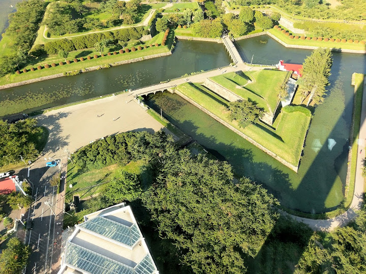 塔頂觀景台俯瞰五稜郭,護城河上是一之橋和二之橋