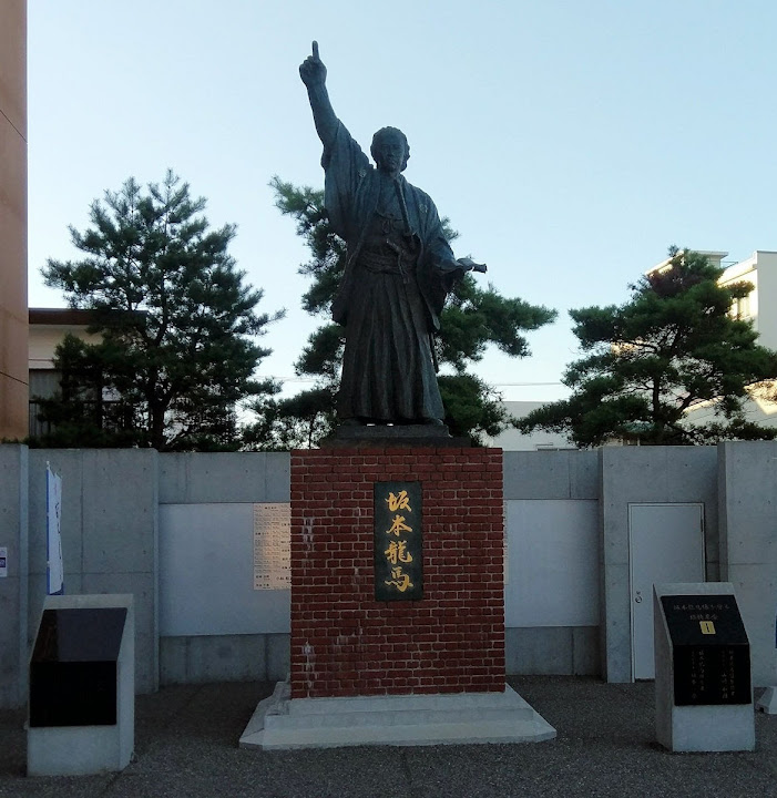 坂本龍馬,維新志士,促成薩摩及長州二藩軍事同盟的推手之一,所提出的船中八策,成為後來維新政府的重要指導方針。 過馬路有一間坂本龍馬紀念館,雕像與紀念館隔街相望,也算特別。多年前在高知市郊桂濱,也曾經過另一座坂本龍馬紀念館。