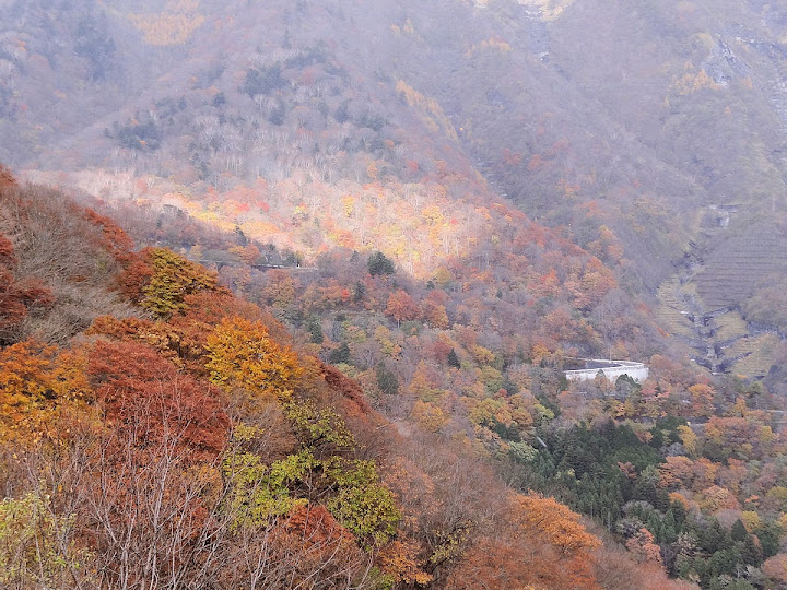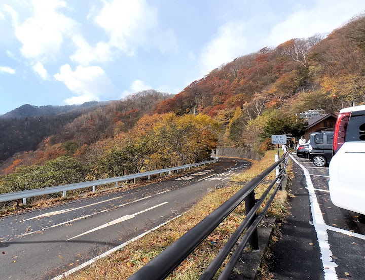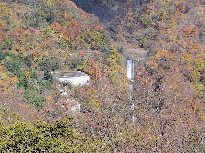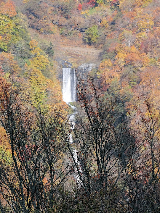 方等滝落差約50米,在盤山公路下山路段(第一いろは坂)旁有展望台。下圖右首畫面外,有一股較小的般若滝(落差20米),被樹枝遮蔽,沒拍到。