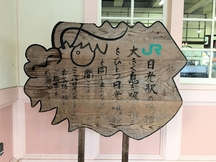 「鳴龍」本是日光名勝──東照宮的特色之一,廳堂中一拍手,便有低鳴迴音,有如龍的呼吸而得名。日光駅也有鳴龍嗎?當時只是覺得看板有趣隨手拍下,看不懂日文,當然不曉得說的是下左圖,日光駅大門天花板頂上,繪有一條鳴龍,抬頭便看到了。至於這地方拍手,會不會有迴聲?我是不大相信啦,不過只能有緣相逢再求證了。