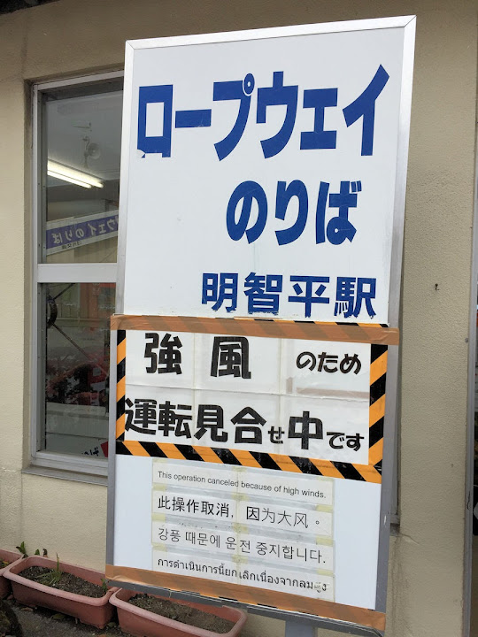 左:明智平湧泉(不能喝),右:強風停駛告示