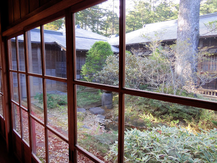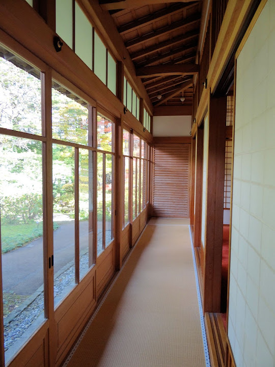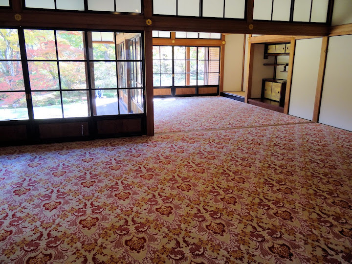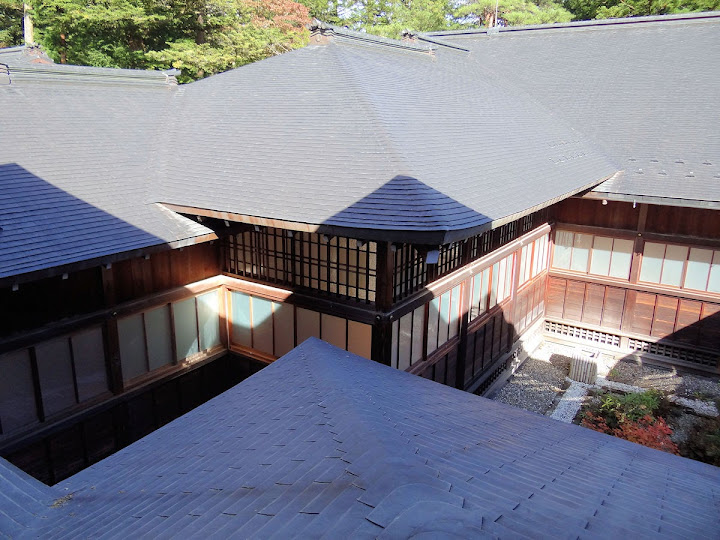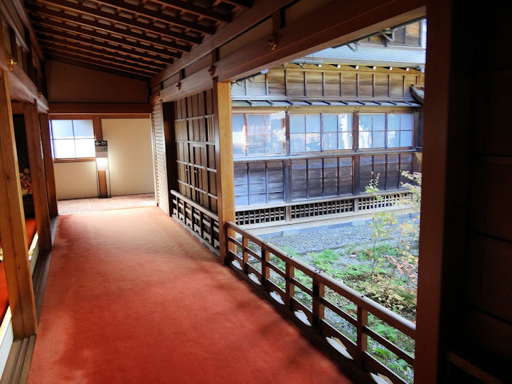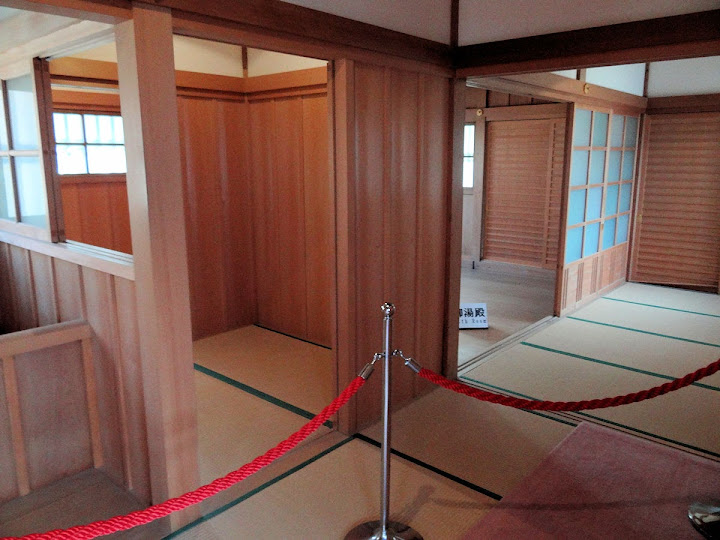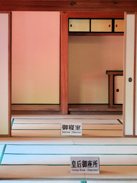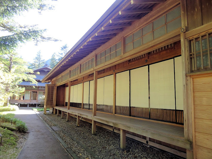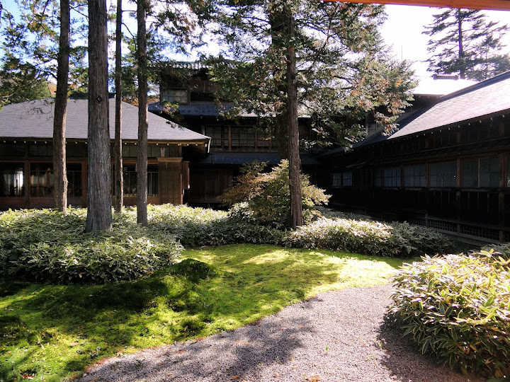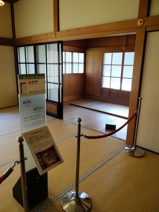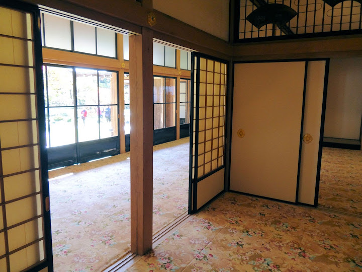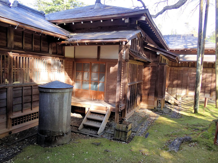 前文說御用邸混合江戸、明治、大正等不同時代的建築風格,其實以我這般外行,都是百年以上古董,看不出有何區別。反正隨著「順路」指標一路走到底,隨手濫拍。倒是幅員廣大,據說有106間房,佔記念公園現有一萬兩千坪面積約三分之一。其中26間供皇室起居,其餘則供侍從僕役居住,可見陣容龐大。
