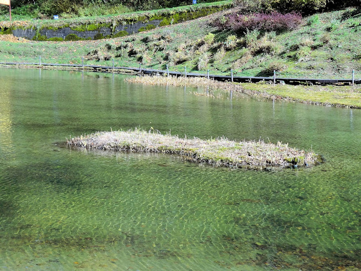 雖然沒有明顯界限,但來到這座あやめヶ池(上圖),加上路旁的招牌(下右圖),就知道來到地頭了。あやめヶ池是森青蛙(學名:Rhacophorus arboreus)棲息地,只是時近中午,沒見什麼活動。下左圖的吊椅,則通往山頭上的巴士站。不想或不能走路的,可以利用巡迴巴士加吊椅的方式前來。