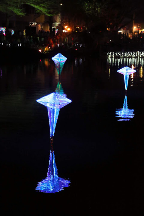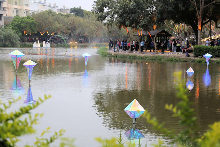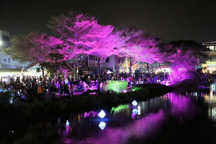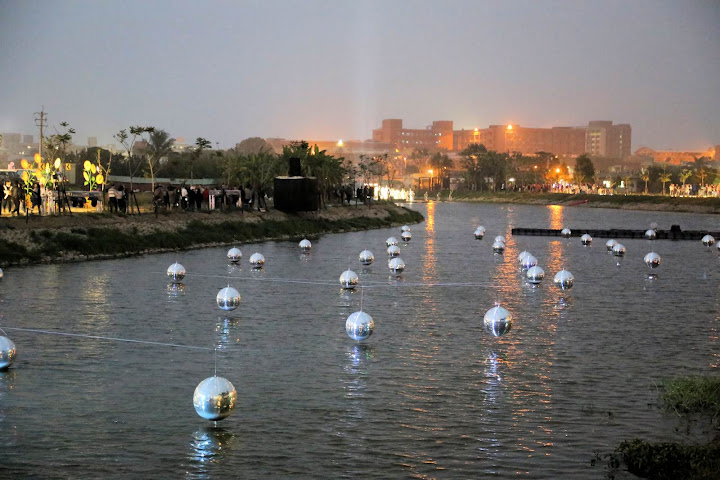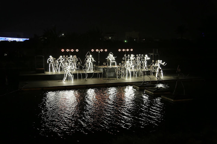 經這番折騰,走到會場天已經半黑,真個華燈初上。沿河岸拿相機跟拍,隨著有如螞蟻雄兵的密集人龍,由下圖的「行星計畫」一路走到「The Froggs」音樂燈光秀回頭,可以見到各個作品從晦暗不明到大放異彩的光影變化。其實應該漏掉不少,只是塞車疲勞,肚子也餓了,隨意打點五臟廟,就兼程北歸睡覺去也。