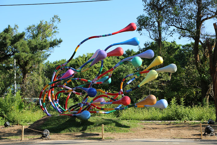 中秋佳節跑到桃園參觀地景藝術節,艷陽高照一片大好,可惜因故延誤,再加上塞車等外在因素,只走完第一站,即大湳森林公園,就回家了。其實夜裡應該另有看頭,但同行友人上個洗手間被咬出三個大疱(肉比較香,是蚊子的菜