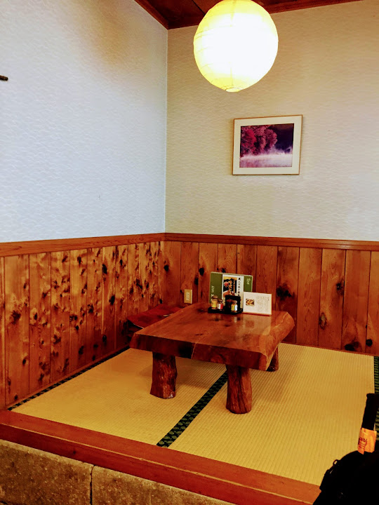 剛到時客滿,分配到上左圖的和式榻榻米,甚不習慣。好在還沒上菜,有一張普通桌空出,體貼的老闆娘問咱們這幫歪國人要不要換,欣然同意,免受曲膝之苦。