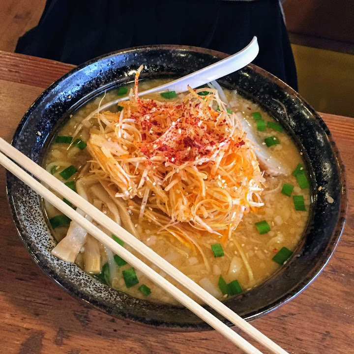 第三家是車站附近的梵天拉麵,既非網民吹捧,亦非旅館推薦,純粹沒得選擇。那天在戰場原走路近四小時,下山天快黑,出乎意外的是,火車站週圍商家竟多半打烊,找不到什麼吃的。民宿主人說要往神橋方向多走點路,可實在倦了,連搭車都懶。本想在全家解決,路上瞥見這裡尚有燈火,將就便吃了。幸而味道不差。
