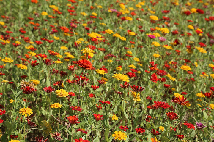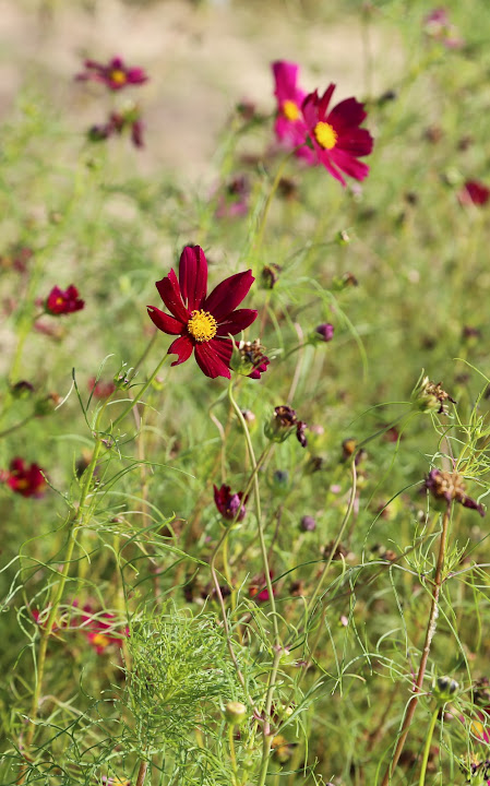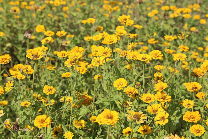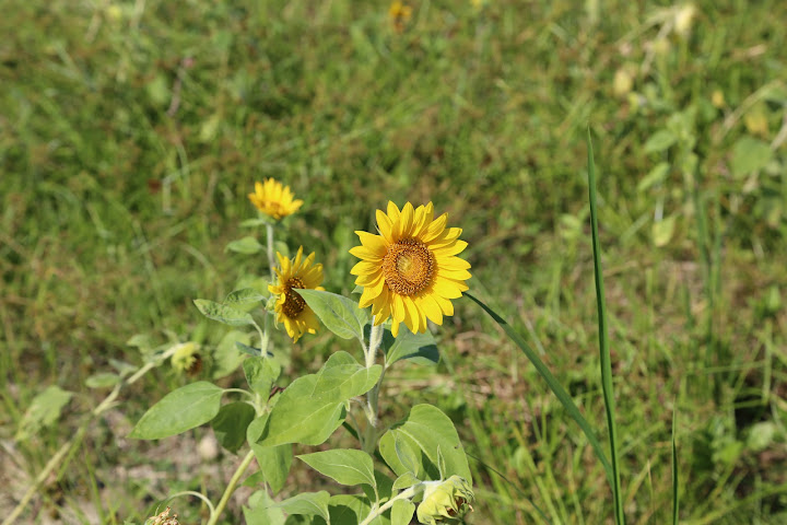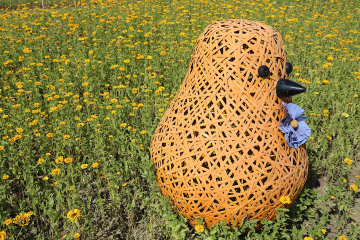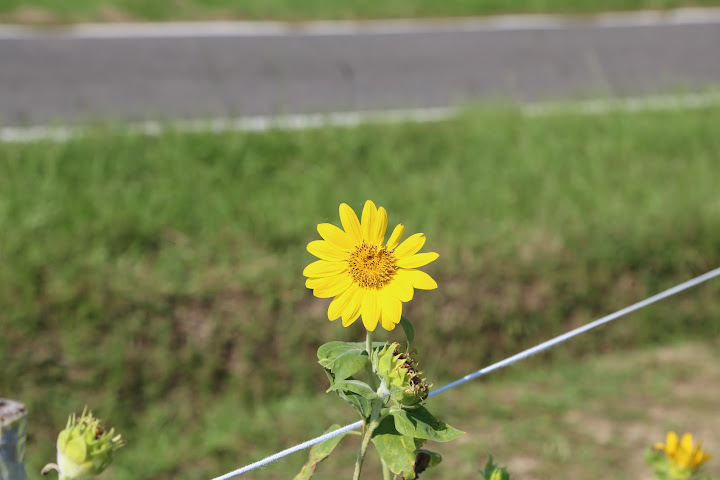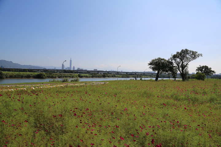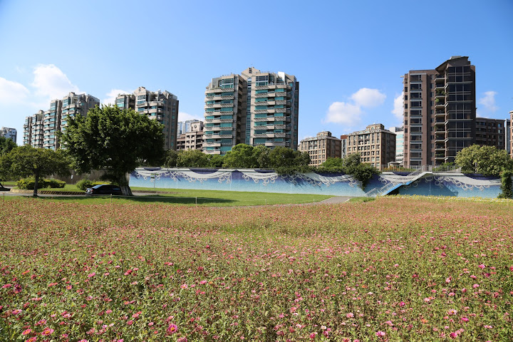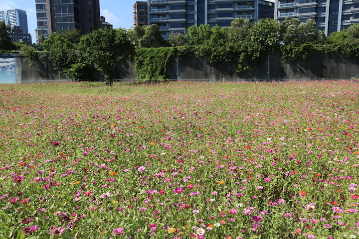 國慶連假艷陽高照,聽說孩子小時候沒事去騎車的美堤河濱公園有個花海,遂背上相機出外散步兼受烈日荼毒。報導說有四千坪,感覺彷彿好大一片,可能公園遼闊,其實只佔最東邊河彎處一個角落,堤外馬路大約是樂群一路接近堤頂大道那段。水門距離稍遠,對步行者比較省事的途徑,是找個人行階梯翻過來。