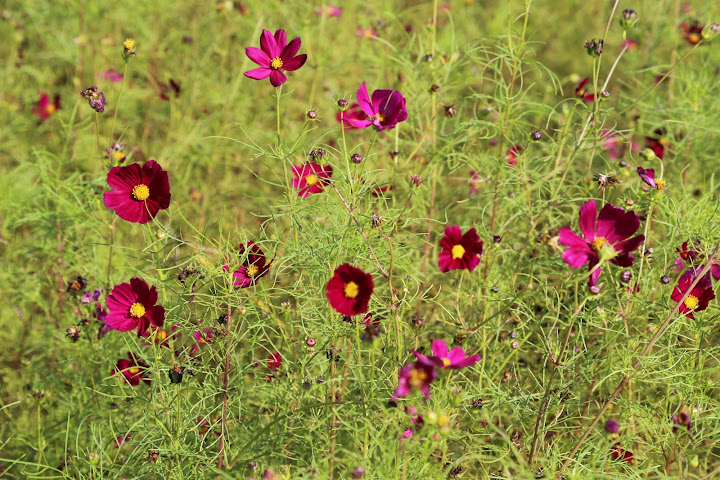 本山人由捷運西湖站下車,把個基湖路從頭走到底(這條路一共就這麼點兒長),翻牆進了美堤公園。原以為花海便在眼前,沒想到迎面一片綠地。再三研究地圖,東行百餘公尺,才真正見識花團錦簇。美中不足的是,向日葵似乎花期已過,大多枯謝,只剩小面積零零落落。其他不認識的倒開得極為茂盛。本山人乃是花盲,來到此間純粹找個因頭活動筋骨,認不得就算了。