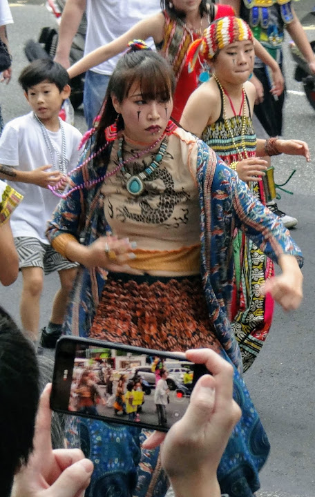 大街上調撥兩個車道給遊行隊伍,其餘照常通行,背景難免抱歉。反正不分男女老幼都很開心,就別計較了。圍觀者眾,相機只能在大家頭頂亂瞄,拍到什麼沒把握,回家再剪裁,因而長寬比例不一。將就看看,高興就好。