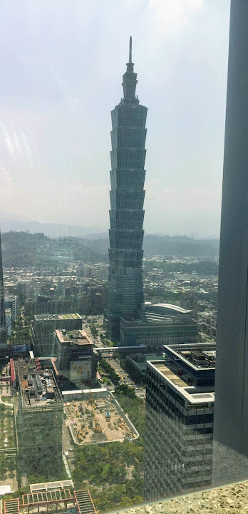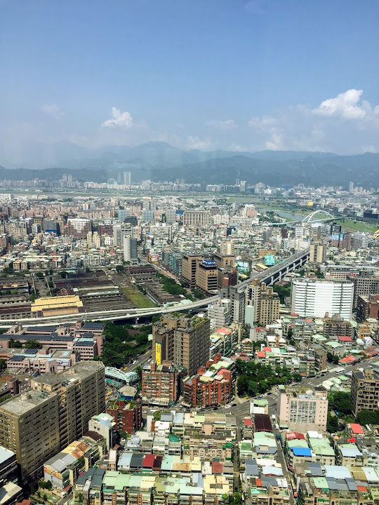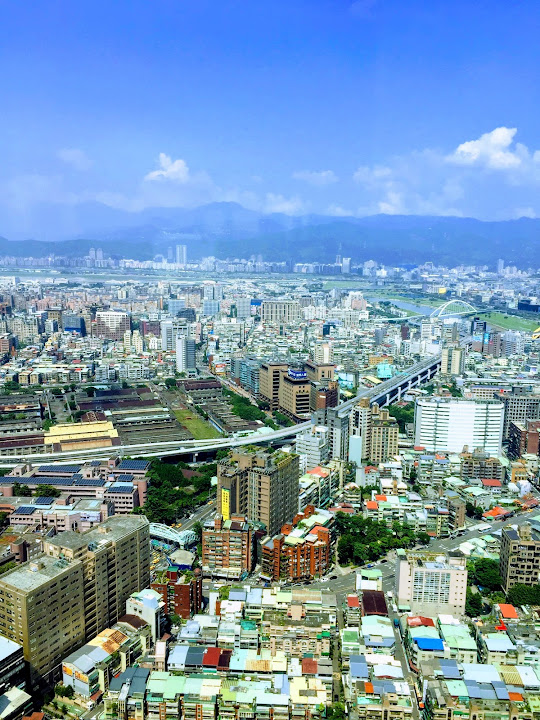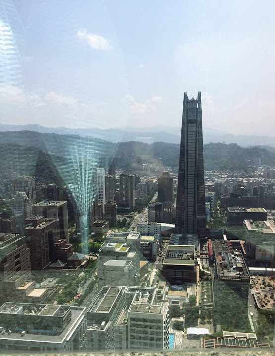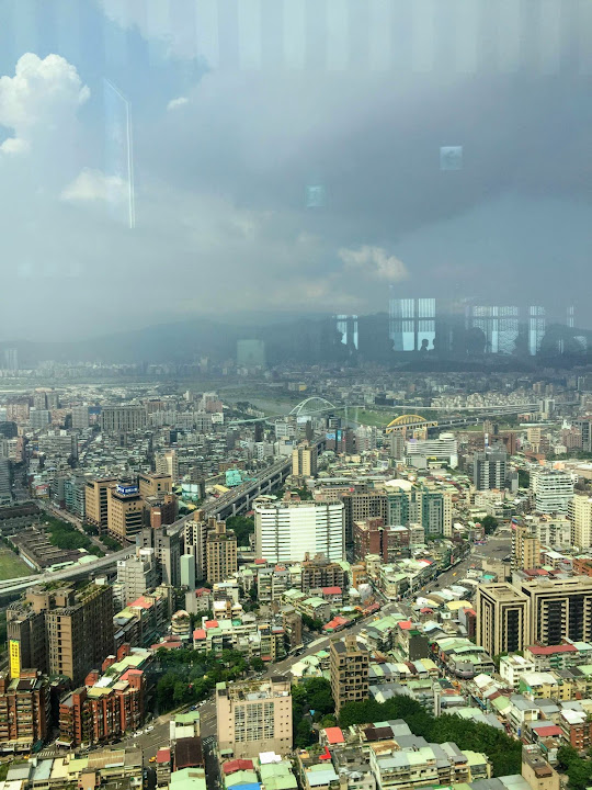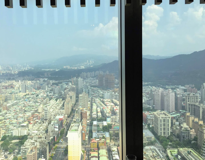 約莫半年前老闆請客,年輕同事選出這家信義商圈高樓頂上的餐廳,一半為了登高好望遠,彷彿是某種享受。不料當天暴雨狂襲,窗外便是雲中,什麼也看不到,只有專心吃飯的份兒。最近又有聚餐,不甘願的那伙人再次串連起閧,又選了同樣這家。這回終於晴空萬里得償夙願,雖則竊以為台北市容有些抱歉,夜幕遮掩也還罷了,朗朗白晝一覽無遺,心情未必大好。不過人都來了,未能免俗仍然拍下幾張照片。多虧早來一步,趁靠窗座位大多無人,速速拍過一輪。不然等到高朋滿座,再擠到人家背後按快門,未免唐突。