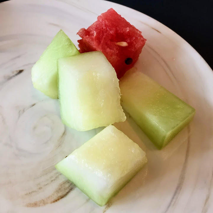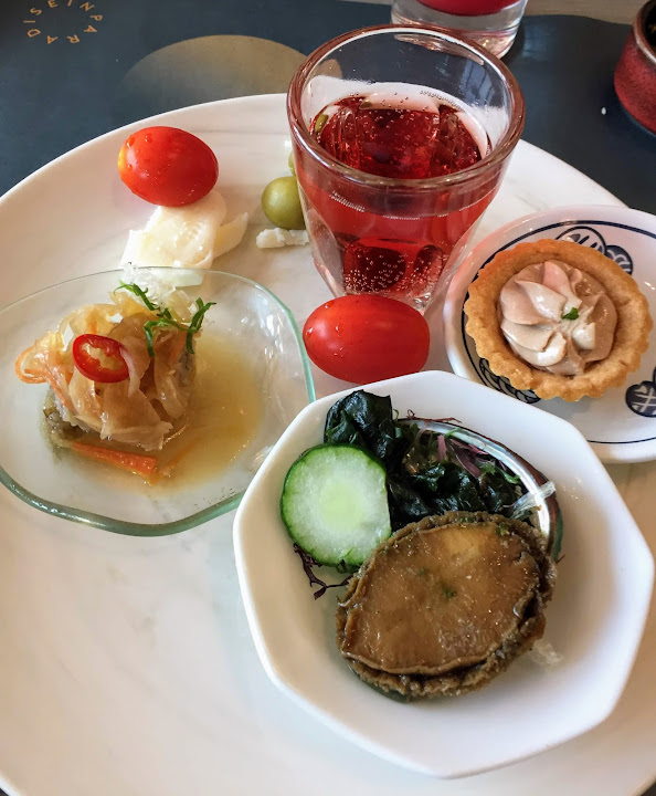 左圖西瓜汁,右圖海味、鵝肝。紅色那杯,記得是某種醋