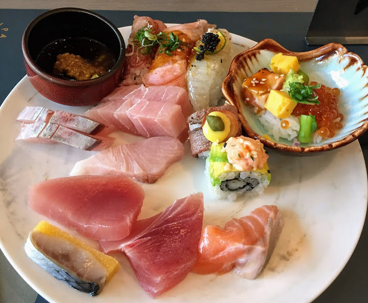 盤中上方有炙燒握壽司