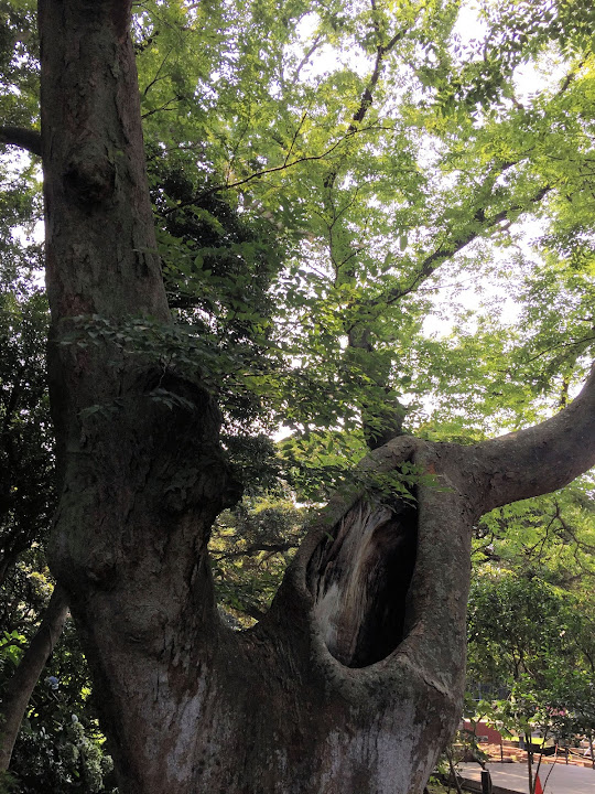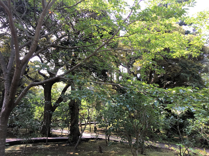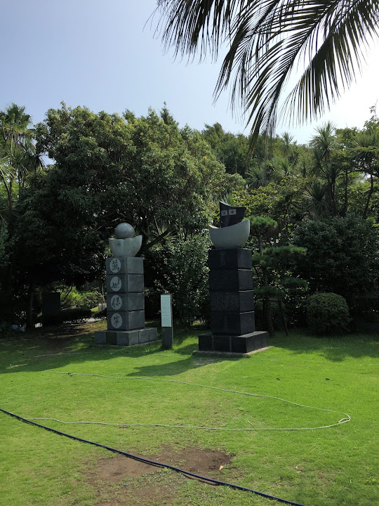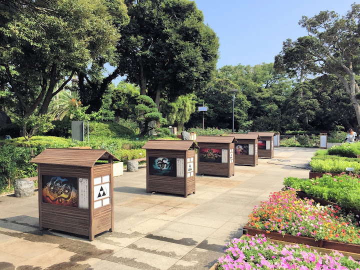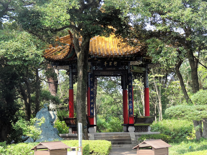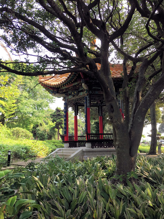 左邊是花園入口的中式涼亭,右邊圓頂是佛寺江之島大師