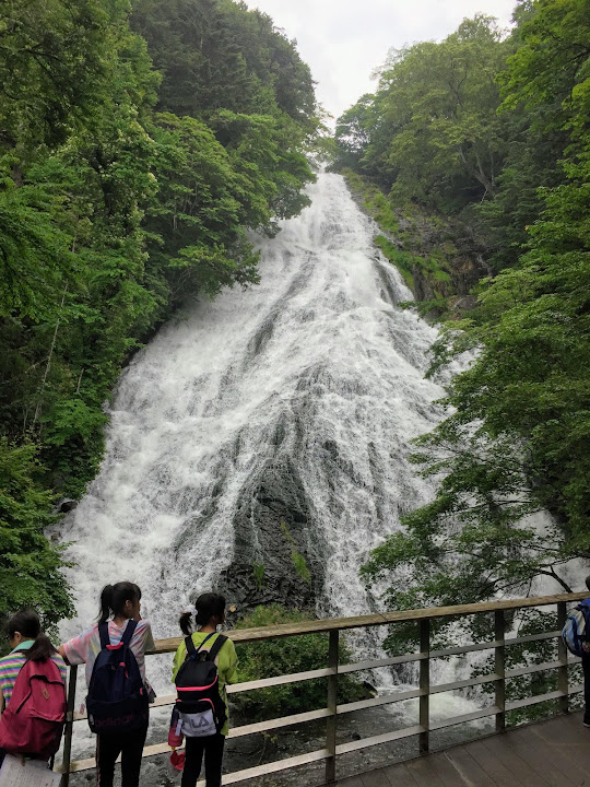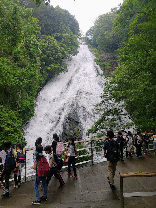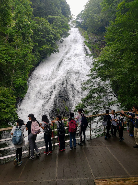 上游的「湯ノ湖」,是湯元溫泉區的火山堰塞湖,湯滝則由湯湖南側缺口,沿陡峭斜坡傾瀉而下,高約70米,總長約110米。本篇照片,幾乎全是在瀑布底觀景台所拍。沿途時而交錯時而並行的大群小學生,也有幾股在此一同賞瀑。向下的溪流稱為湯川,穿越戰場原,經龍頭瀑布再下一道陡坡,最後注入中禪寺湖。