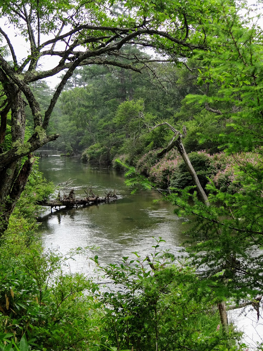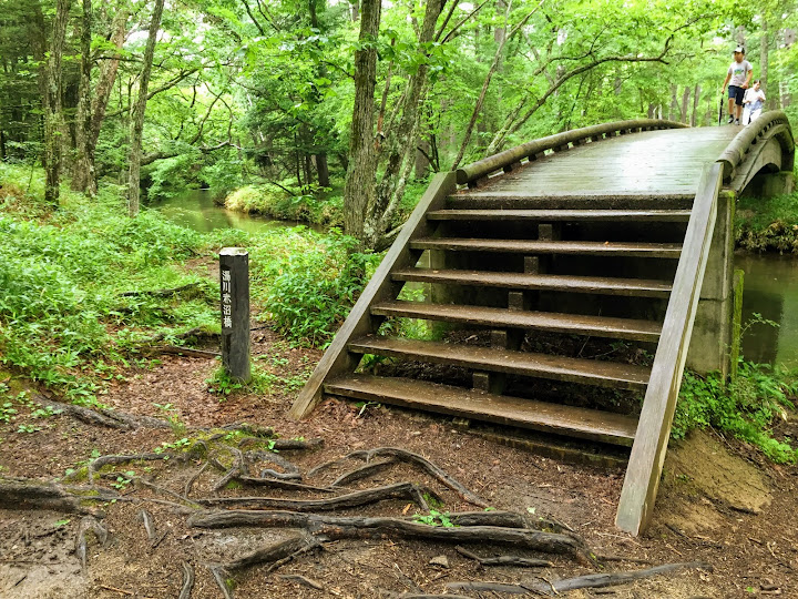 地名源自上古時代,諸神爭奪這塊寶地,最後由二荒神勝出,雄據男體山,一統江湖唯我獨尊。這塊四百公頃溼地,大約就成了他家後院啦。海拔高約1390~1400米,地勢平坦,相當好走。自然研究路則是沿著貫穿戰場原的湯川而開闢的步道,經過溼原的部份大都鋪有木棧道,赤沼以南林地則多為泥土路,適逢午後大雨,頗為泥濘。