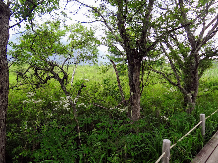 因為好走兼自然環境優美,動植物豐富,成為栃木県小學生最喜歡的健行路線。這天我們便遇上至少兩個學校幾十波大小孩童,一路大聲打招呼,甚是歡樂。溼原是個賞鳥的好地方,沿途不時見到愛鳥人士攜帶巨砲搜索鳥情。野生動物最多的據說是鹿,不過緣慳一面。蜻蜓蝴蝶甚至蜜蜂倒是長伴左右,途中還被不明昆蟲螫了兩下,怕蟲子的需要一點防護措施。夏天花草茂盛,可惜全不相識,就請隨便看罷。