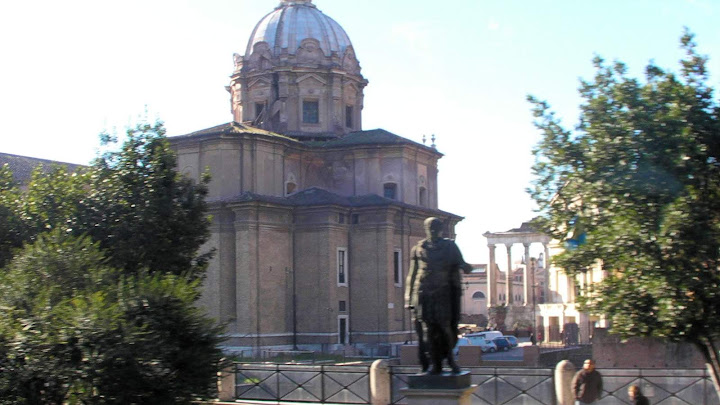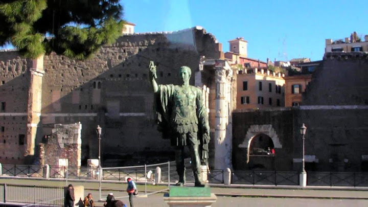 凱撒像,後面是凱撒廣場 (Forum of Caesar) 遺跡