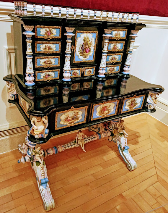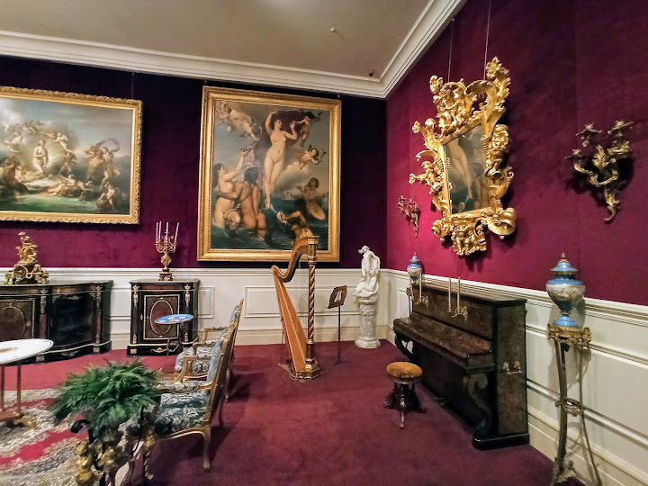 前幾張照片出自其中一個小房間,稱為沙龍廳,呈現流行於19世紀歐洲上流社會的休閒社交型態。飾物器皿無不考究,更有室內樂演奏,過日子真是愜意。
