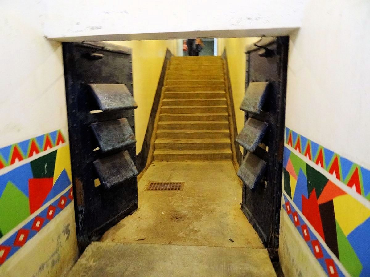 入口前有厚重混凝土牆屏障