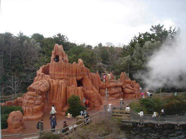 誰知直到這日早晨出發前,都還是艷陽高照。嫌雪衣累贅不便遊玩,就都扔在房裡。入園便依照George事先規劃的路徑,抽第一張巨雷山的FP牌,依序玩了馬克吐溫號汽船、叢林巡航和西部火車。在馬克吐溫號遊河的時候,太陽公公開始躲進雲層裡。叢林巡航排隊稍久,風愈來愈冷,乾脆飄起雨來。