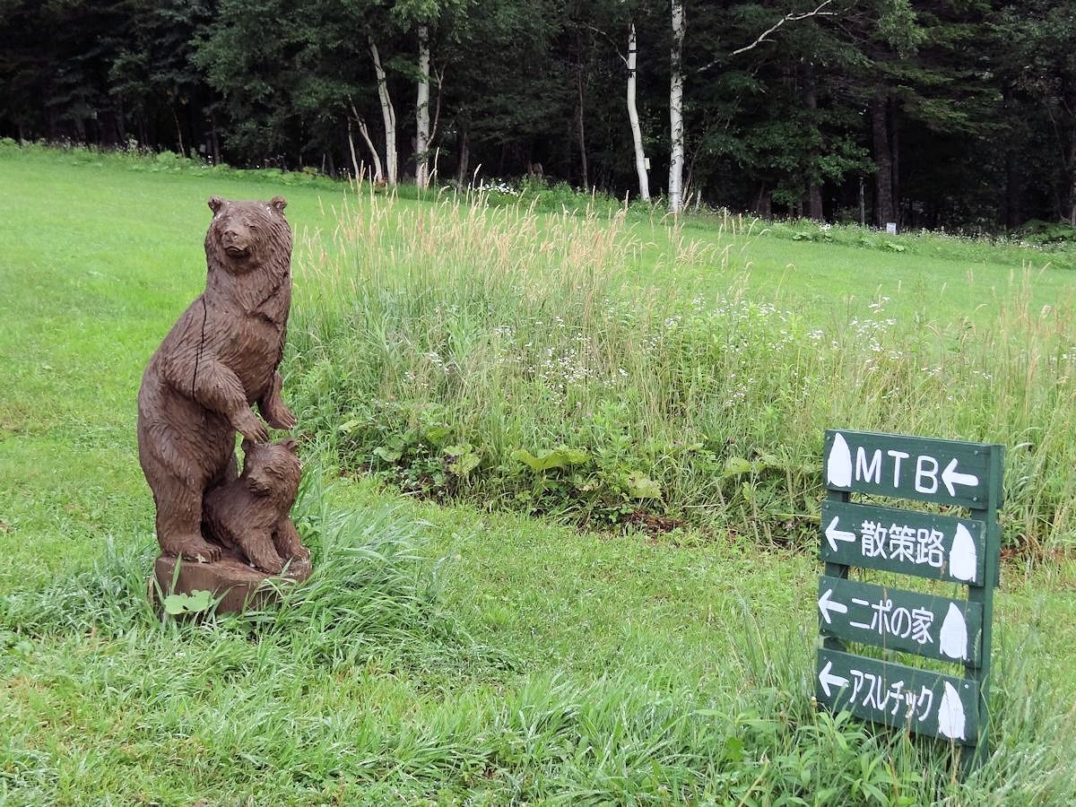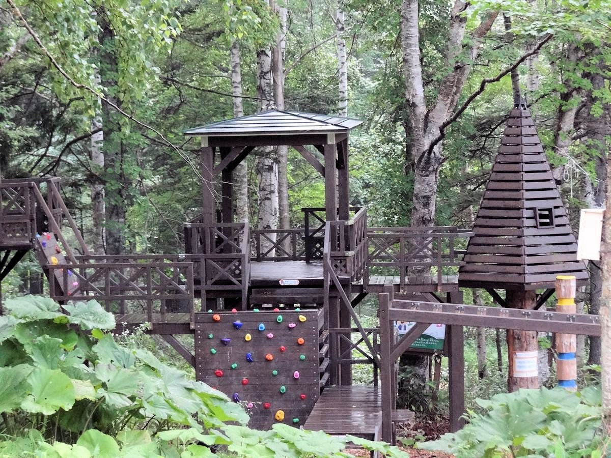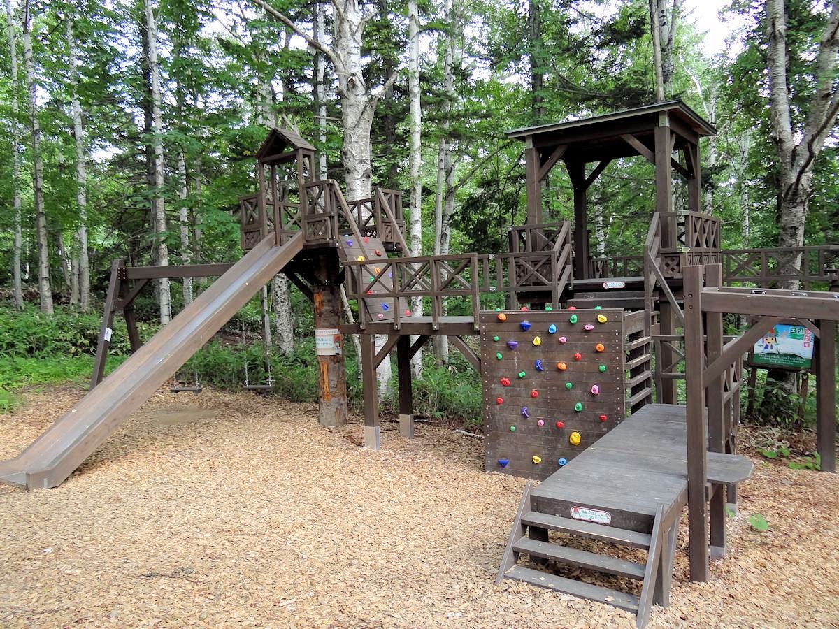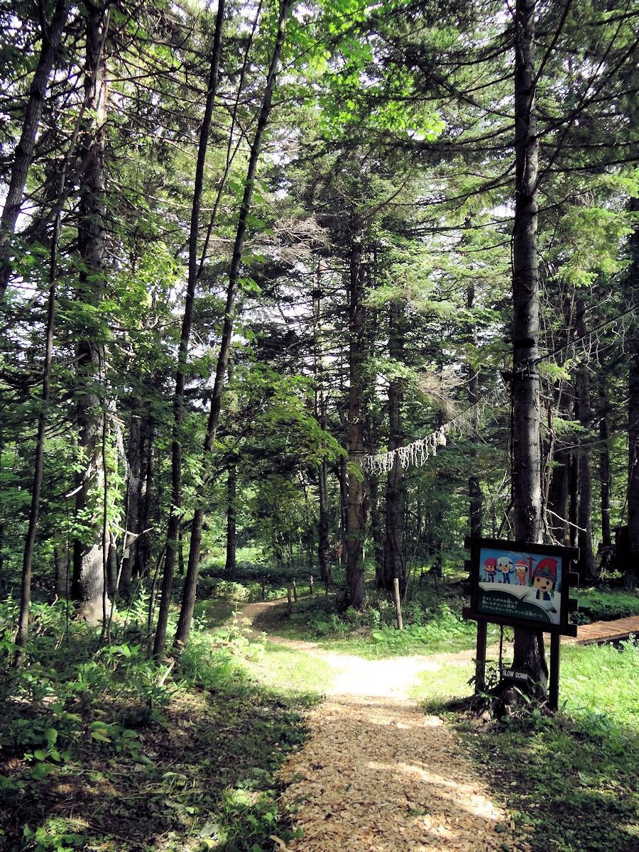 リゾナーレ到塔娃之間的樹林裡,有一系列以「ニポ(NIPO)」為名的幼兒活動場所。「ニポ」是愛努語「樹的孩子」之意,不過當時我們並不知道,嘻嘻哈哈唸著,變成中文「二寶」。給孩子玩兒的地方,特別注意安全,泥濘小徑都灑上木屑,免得滑跤。