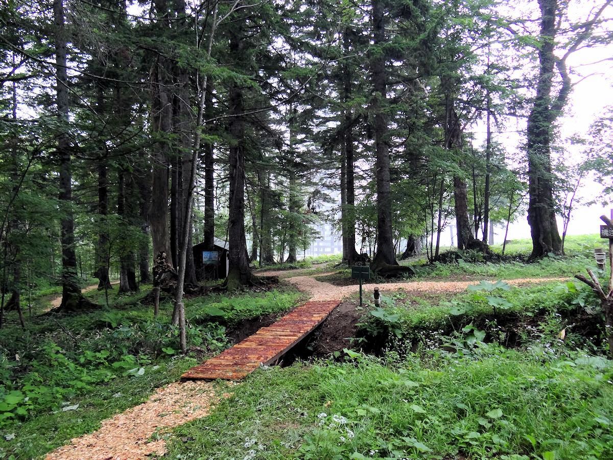話說因為下雨,多數戶外活動都無法進行,最後唯有漫步林間。由住宿的塔娃開始,沿空中走廊來到森林餐廳,恰好遇上接駁車,本來想直接到微笑海灘,不料弄錯方向,搭一小段到更高處的リゾナーレ雙塔。既是如此,乾脆就沿著稱為「散策路」的林間小道,一路走到纜車站。