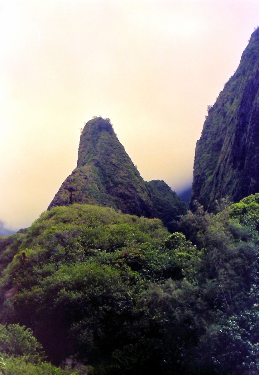 次日一早往Iao山谷健行.照片中的針山(Iao Needle)是著名地標.歷史上統一夏威夷諸島的Kamehameha國王,率大軍追擊茂宜守軍進入Iao山谷,血戰得勝,積屍成山,河水為之斷流,故稱「伊奧斷流之戰Battle of the Dammed Waters of Iao」.