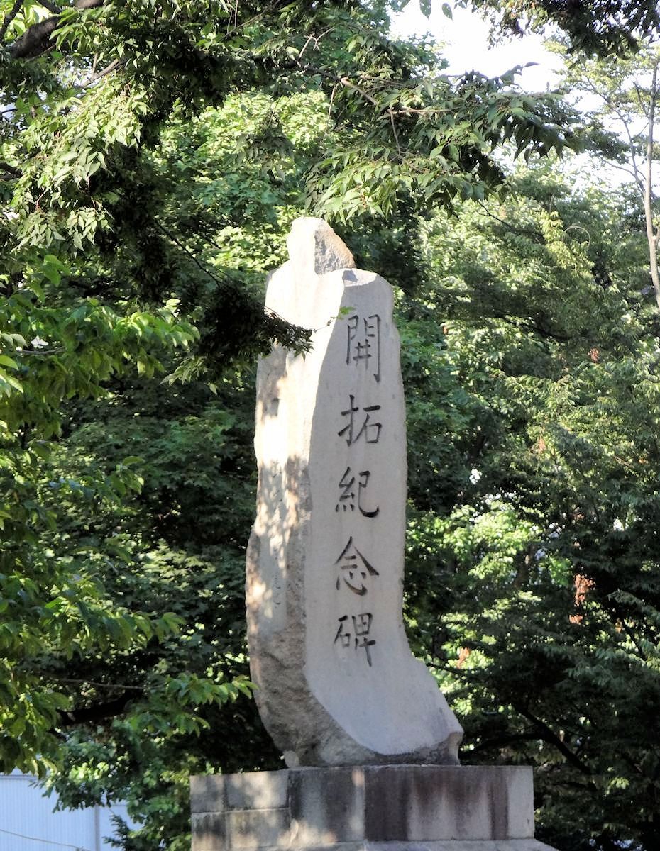 開拓紀念碑建於1886年,並於1899年移至大通公園。碑面文字,長期以來多認為出自一度建立蝦夷共和國的榎本武揚手筆。近年研究則指出,應係由「淳化閣帖」中,王羲之的黃庭經、曹娥碑等帖,集字翻拓而來。