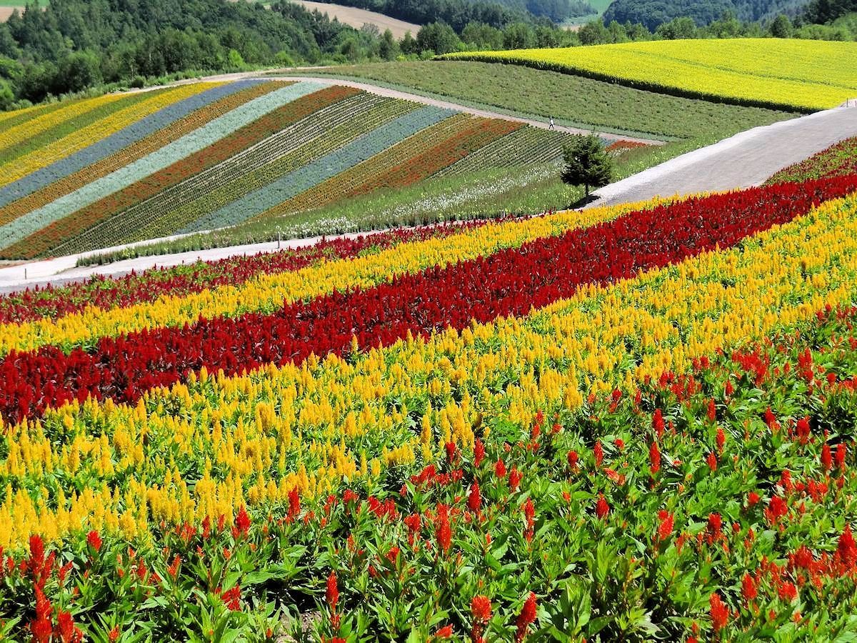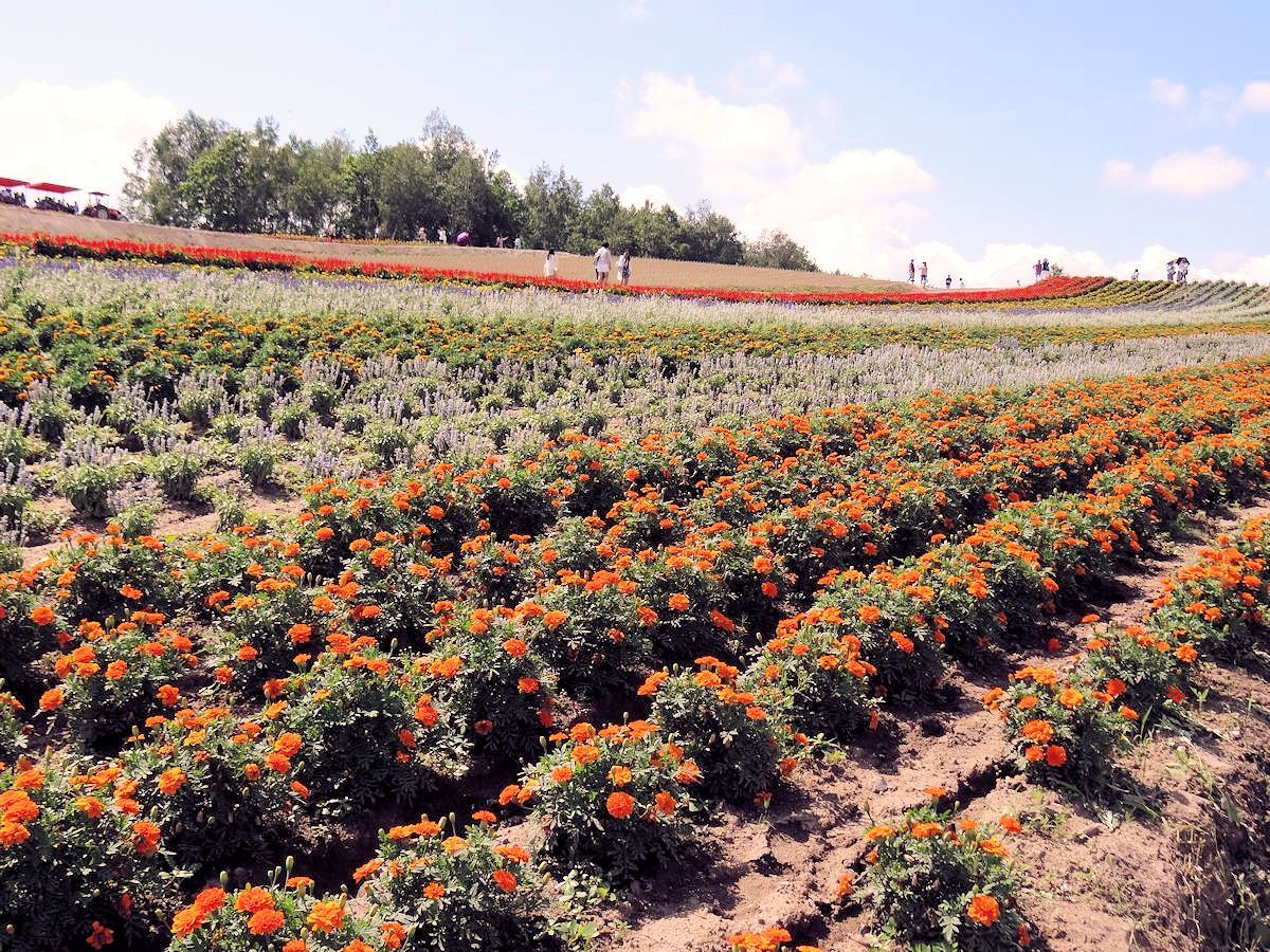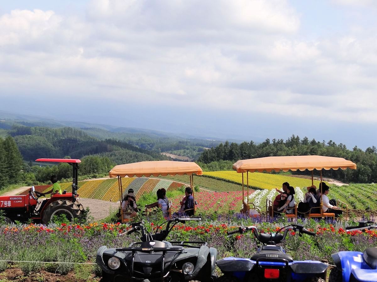 四季彩之丘則是代表性花圃,團客一般都會拉過來,搭乘稱為「四季彩NOROCCO號」的拖拉機巴士遊園一周。因為搶在陸客之前用完午餐,遊園一周之後,還可以有四十分鐘自由活動,到處拍拍照。懶得走路的,可以租用單人蹦蹦車或高爾夫球車。個人以為,既然都搭過拖拉機,除非時間很短,或對駕車特感興趣,不然靠兩條腿賞景,會精緻踏實得多。展望花畑號稱七公頃,其實沒有想像中來得大,儘管慢慢走都來得及。