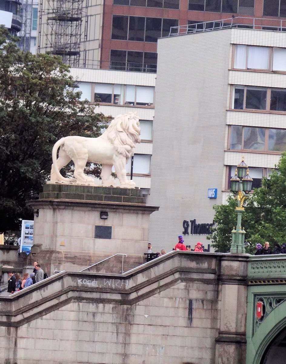 左圖:片尾大反派布洛非墜機的地點,就在這座西敏橋。鏡頭帶到橋頭河東獅,不,「南岸獅子」,一閃即逝,有興趣不妨稍加留意。(細節及其他地標參見「泰晤士河遊船」及相關格文)