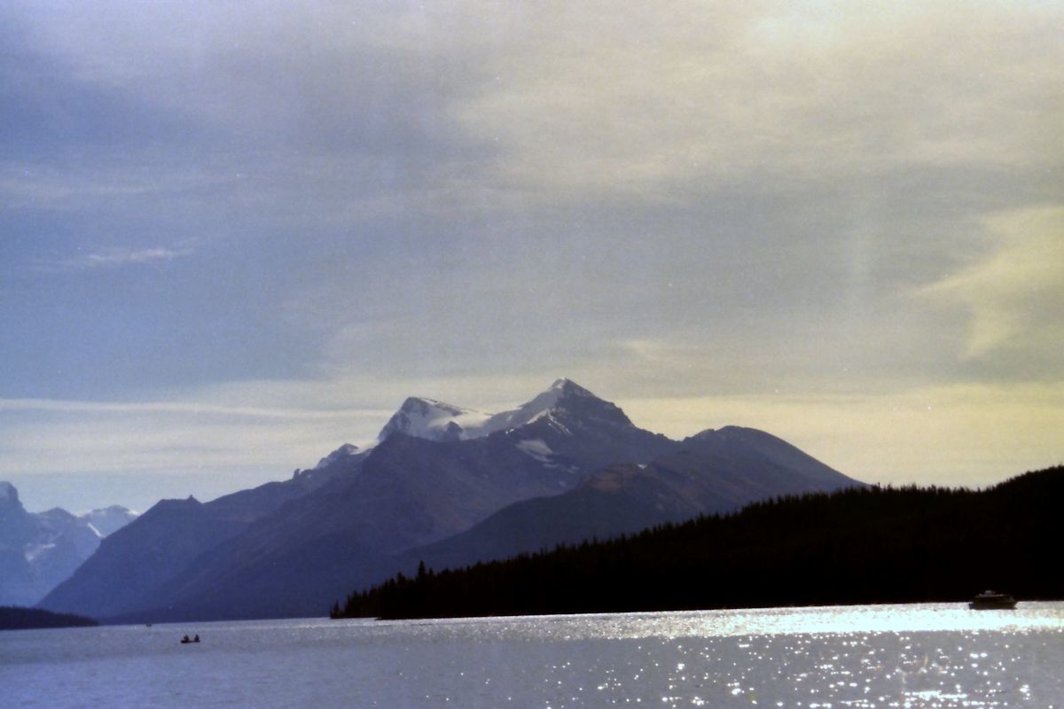 遊客在碼頭旁的餐廳用過包肥大餐,乘遊湖快艇呼嘯而去。湖面狹長達22哩,船程終點是著名的精靈島。這座鼻屎大的小島上矗立一撮針葉樹,是洛磯山區代表性的景點之一,出現在許多海報、明信片上。(精靈島的經典畫面,這個角度乘船旅客不易取得)