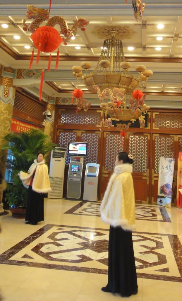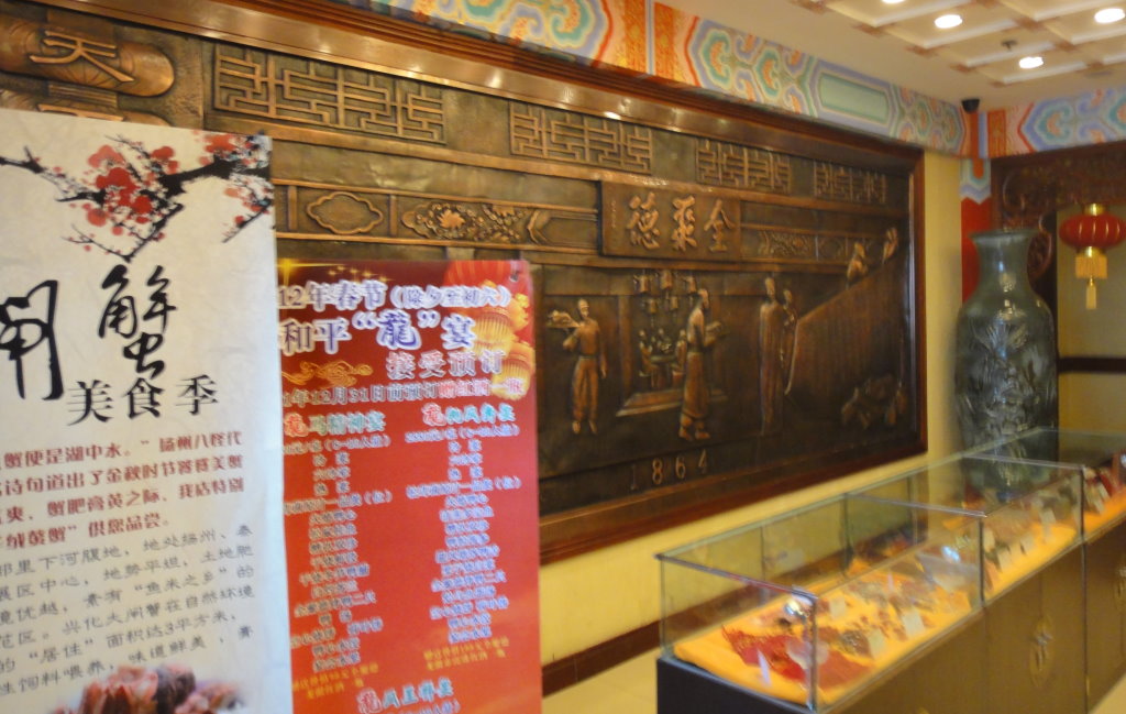 左:全聚德盛裝的接待姑娘。右:新鴻基大樓內的東來順門面