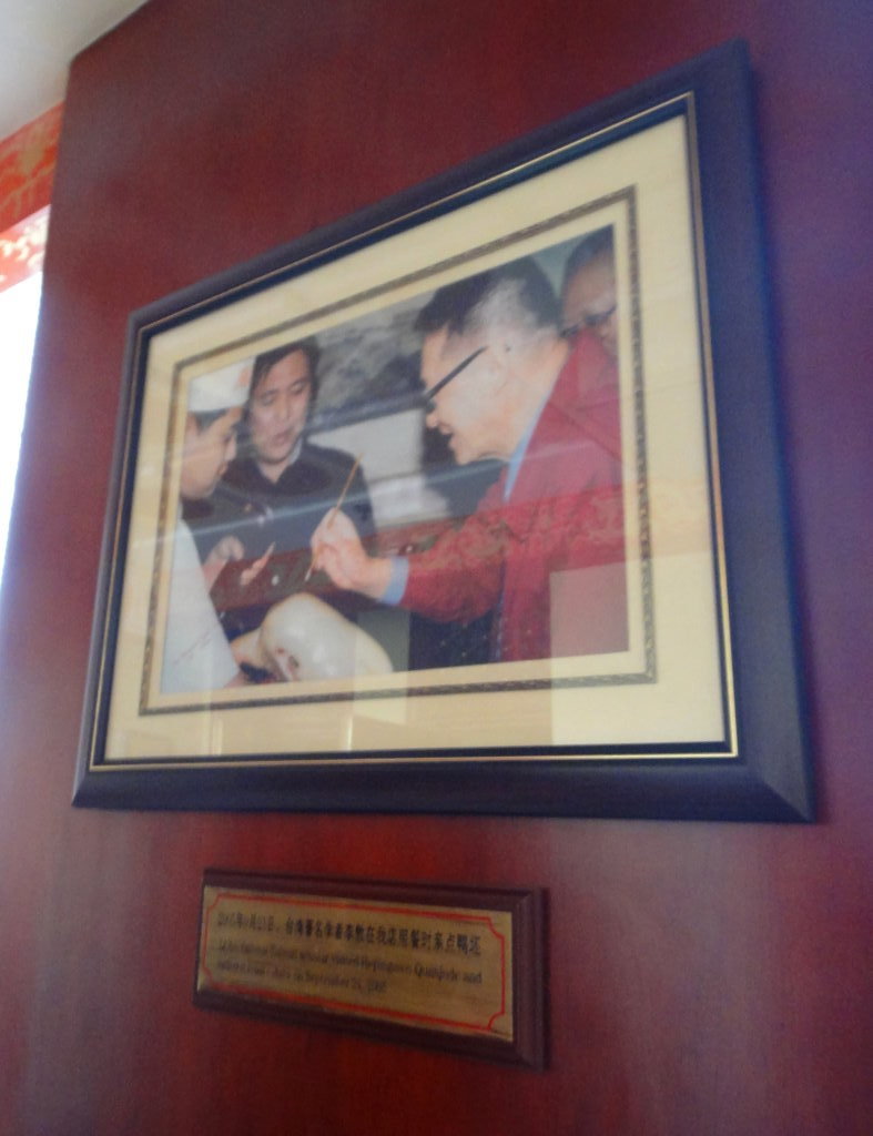 走廊當中,發現一張照片上,人物挺眼熟。穿招牌紅夾克的李敖,正往鴨胚上簽字。想來出爐的烤鴨倘若沒了記認花押,就準是給人調了包。