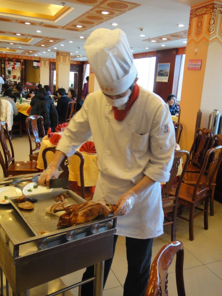 全聚德,去的是號稱世界最大烤鴨店的和平門店,可容納兩千人。上菜前,師傅出場,當著賓客露一手片鴨絕活,乾淨俐落,沒半晌工夫成了副鴨架子。