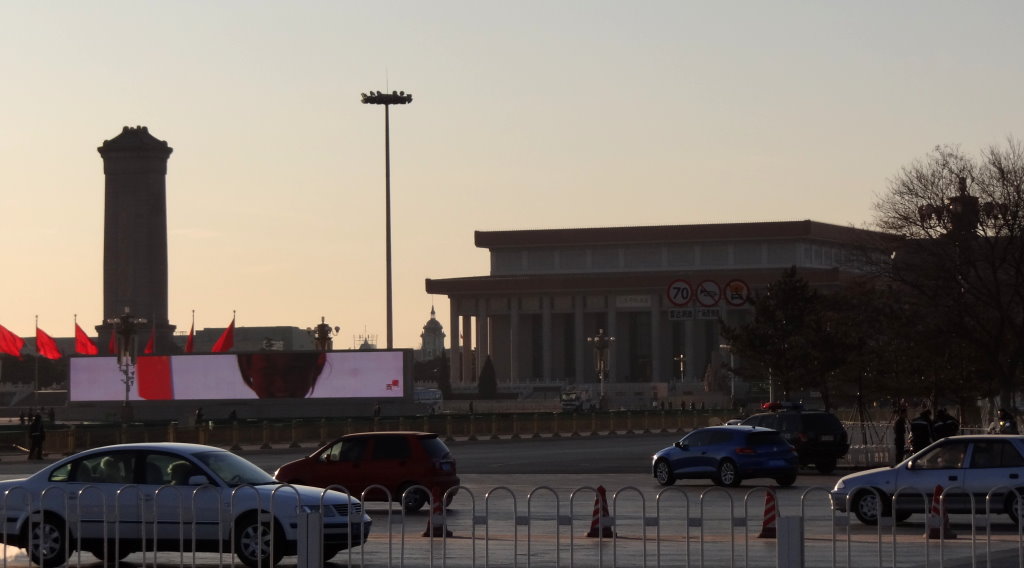 紀念碑南面是毛主席紀念堂,位於北京中軸線上,已拆除的中華門遺址。不同於蔣介石早已移靈慈湖,中正紀念堂只餘銅像,毛澤東的遺體則仍在此間。因不在參觀路線上,日間畫面雜亂,又有點背光;所幸幾天來遊覽車常在天安門廣場附近晃悠,偶然拍到的夜景,有時反而清爽。