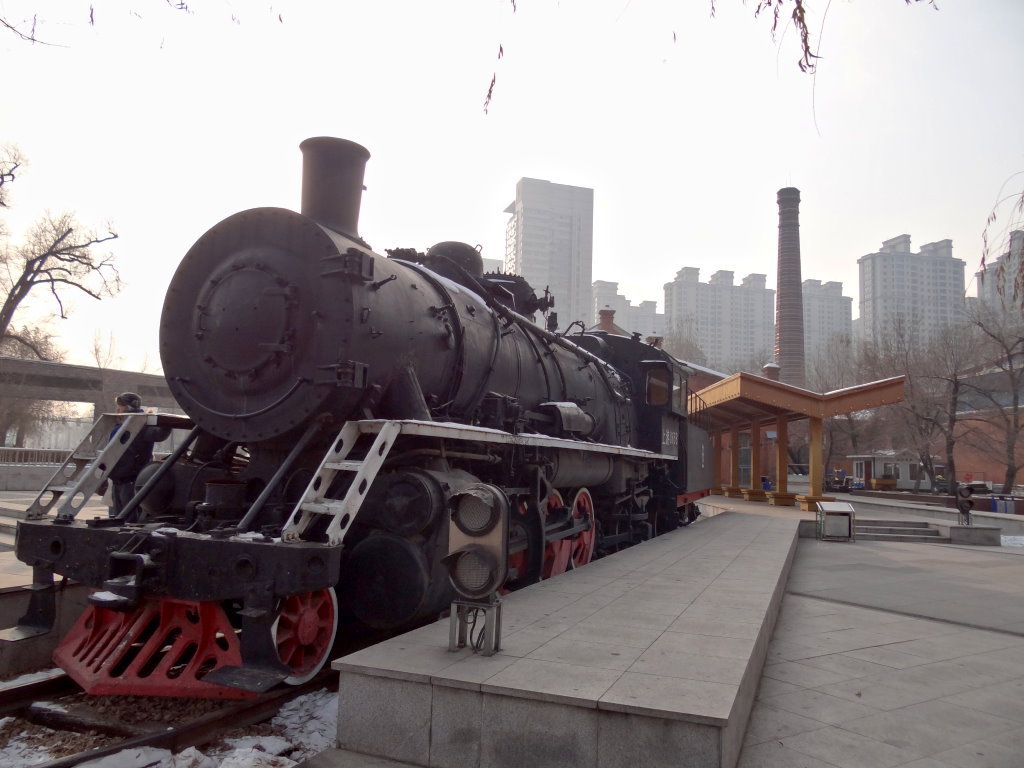 哈爾濱車輛廠創建於1898年,為中東鐵路生產所需要的鐵公路車輛,是哈爾濱乃至整個東北重工業的源頭,中國第一個工會組織在此成立。現今雖已遷離市中心,但仍是生產重鎮。原址更新整建後,留下部份廠房和這節火車頭在廣場上供人懷舊。火車頭剛搬來時據說鏽跡斑斑,頗受詬病,後來上漆整理煥然一新,連舊廠房都有了現代感。雖說減少幾分古意,但也不能說破破爛爛才顯真實,分寸拿捏不很容易。現貌古今交雜,卻不失美感;喜不喜歡,就隨各人評價囉。