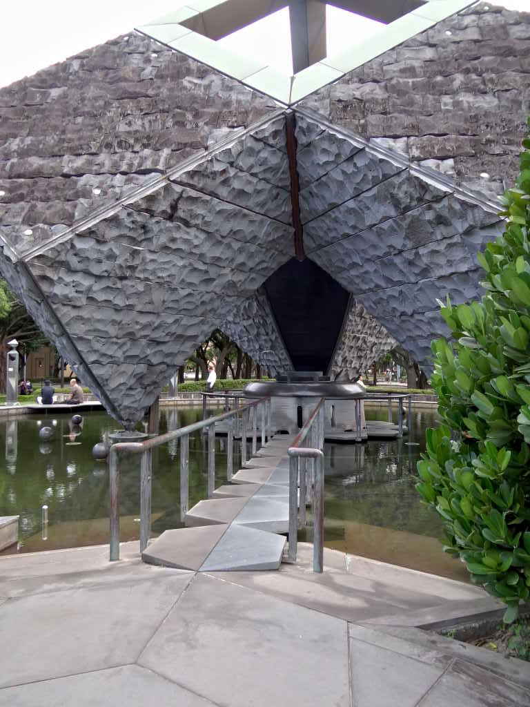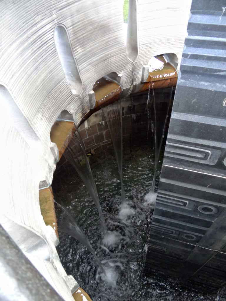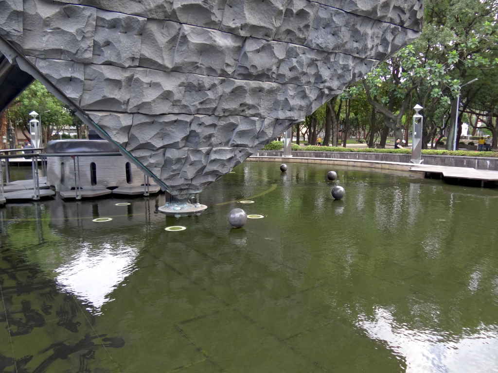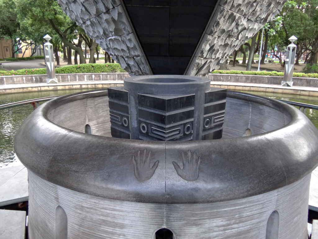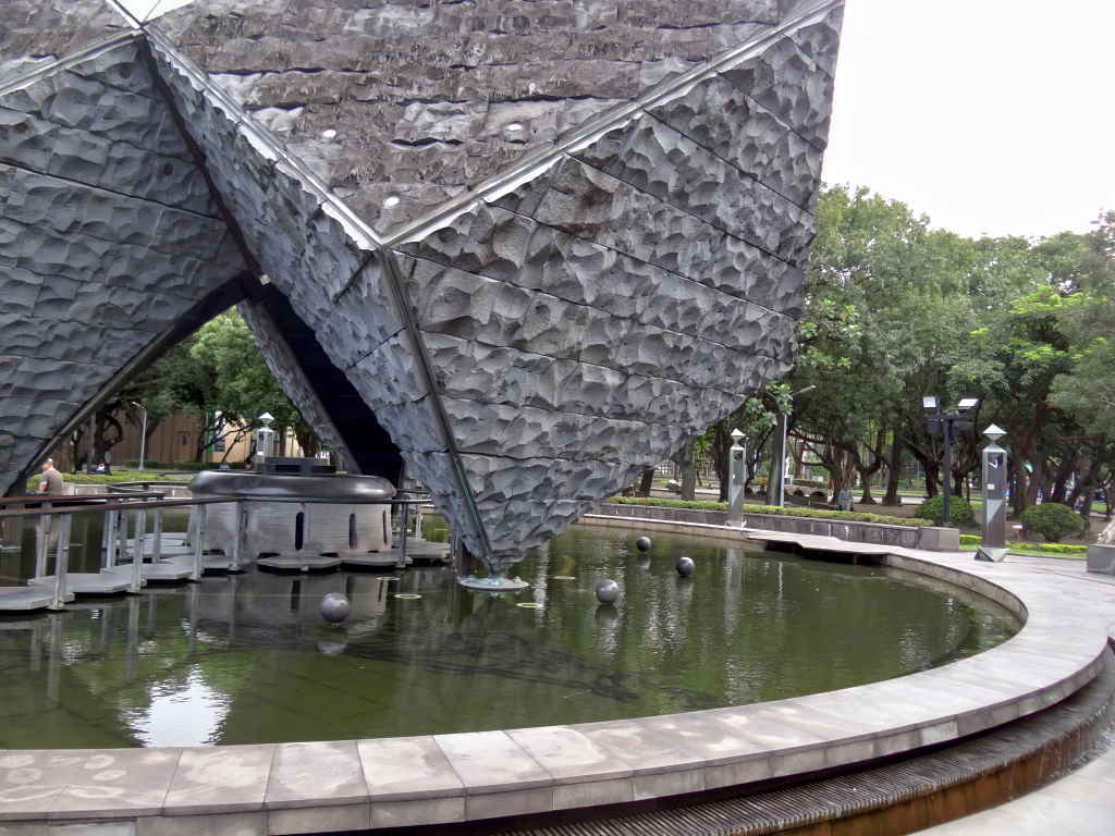 仔細一看,大概可以瞭解它為什麼這麼不易親近,那根本不是設計目的。尖銳似戟刺向天空,立方基座線條冷硬,訴說的肯定不是暖意溫情。直到地面才有曲線調和心境,平靜無波的圓形水池沉澱心情。中央淙淙流水入甕引人沉思,個人以為是設計精華。如果選擇一個清靜午後,避開政客盲眾的矯飾喧囂,當真把手按進掌痕,或許未必體會作者原意,卻肯定能為你心弦迴盪幾許。