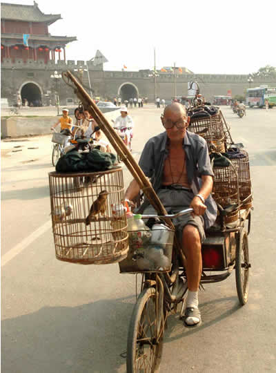下下圖︰一位養鳥人騎車載著鳥籠駛出歸德古城北門