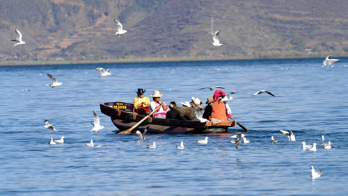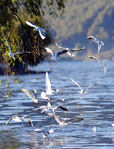 11月16日,紅嘴鷗在雲南省寧蒗縣境內的瀘沽湖水面上飛翔。雲南省瀘沽湖以其獨特的摩梭風情和秀麗的山水風光聞名於世。近年來,當地政府採取垃圾清運、污水處理,以及村民整體後移搬遷等多項生態環保措施,有效保護了瀘沽湖的水質,為數萬只紅嘴鷗越冬創造了良好的環境。