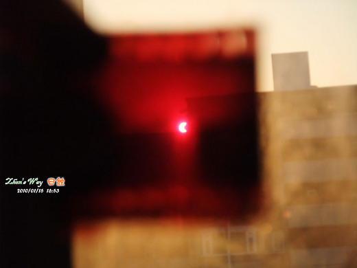 今天,傍晚四五點出現日蝕,從房間窗戶往外望,便可見那似月的太陽。我只有看見四點多的日蝕,那時候太陽還算強,只好用底片遮一下光,再拍照,可惜的是還是被建築物擋到一些。聽媽媽說,他在鄉下午點多時走到空曠地,發現那夕陽像月兒一般,黃黃彎彎的。媽媽說爹地拿起相機卻拍不起來它的美,我想,是天色漸暗,相機無法收藏他那美麗的時刻。