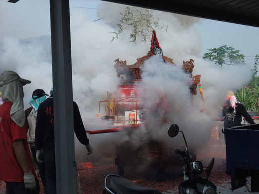 當然少不了陣頭表演,八家將,三太子,七爺八爺,應有盡有。這天晚上神轎要入廟時是最多人圍觀的時候,神轎要入廟前要擂轎,就是在玄天上帝廟前的廣場繞,不時會向人群衝去,這時候阿,有人騰空被人群擠向外,有人被前面後退的人擠進一旁的池塘裡,有人從此找不回拖鞋。雖然沒有鹽水蜂炮刺激,但是也很瘋狂。