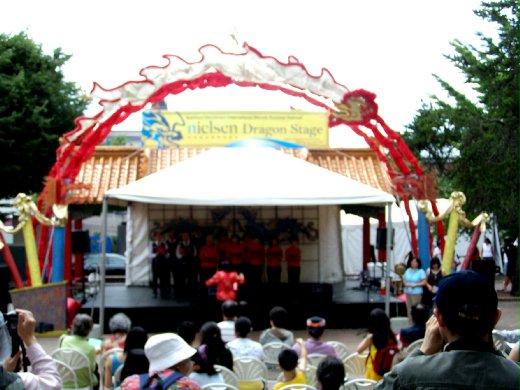 長長的人龍,出現在「麥當勞屋」之前。「麥當勞」是這次「華埠/國際區節」的主要贊助商。屋裡有好玩的投籃和擊中國鼓的遊戲,還送買當勞鉛筆和提袋,又可和麥當勞叔叔免費照「拍立得」相片。我也去排隊了,為了要拿提袋──可以送給親戚的小朋友,也為了拍照片──因為人家也喜歡麥當勞叔叔啊!