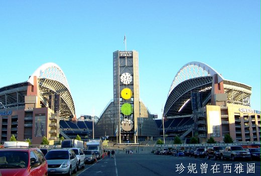 球賽當天終於來臨,我們來到球賽場地 Qwest Field。Qwest是西雅圖的一家電話公司,以美金7千5百萬元(新台幣24億元),取得15年的權利,讓公司的名稱掛在這個球場。
