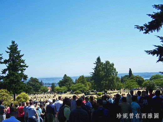20日上午我們驅車前往西雅圖的「湖景墓園」(Lake View Cemetry),也就是李小龍和他的兒子李國豪(Brandon Lee)長眠之處。這個墓園的名稱由來,是因為面對華盛頓湖的美麗視野。墓園裡還有許多名人的墓地,包括印地安的西雅圖酋長(Chief Seattle)大女兒安琪琳公主(Princess Angeline)。但是公主的名氣畢竟沒有李小龍來的大。本來我還擔心「湖景墓園」大,得花些時間才找得到李小龍的墓地;一進入墓園,遠遠就看到一大群人,看來我是白操心了。
