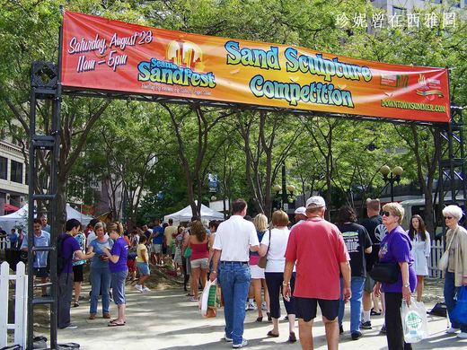 儘管立秋已悄悄來臨, 8 月的西雅圖,活動仍舊熱鬧滾滾。週末( 23 日)在西雅圖市中心便舉辦一個有趣的活動-西雅圖沙灘節( Seattle Sandfest ) 。原本整齊美觀的「西湖購物中心」(見「西雅圖的市中心商圈」 )的門口,以及對街的「西湖公園」(我曾在「西雅圖派克市場的豬兒大遊行」 提到這個公園),矗立了數座美麗又有趣的沙雕。