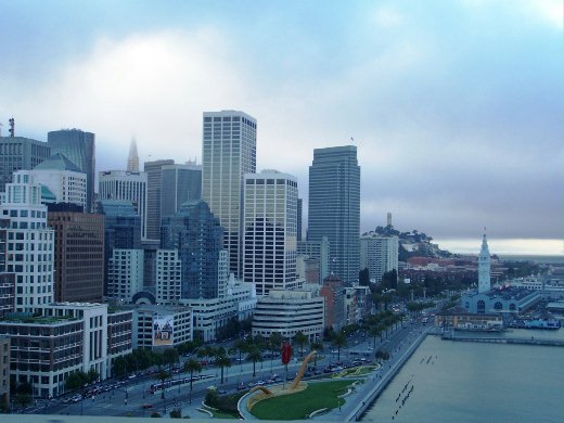 到了下午五點多,終於進入了舊金山。舊金山的天空,籠罩著輕霧,果然不負「霧都」的美名。眼看著溫度計從三位數逐漸降到華氏六十八度(攝氏20度)。這是在「灣區大橋」(Bay Bridge)上拍到的灣區美麗建築。