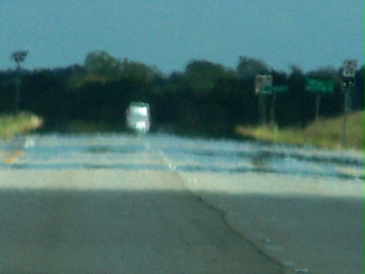 要看到這樣的影像,必須在炎熱的大太陽中,駕駛在公路上。眺望遠方的公路,會看見路面有一灘積水。等車子開近,地面上的積水便消失無蹤。望向遠方,又有另一灘積水出現在路面上,等一靠近,這攤水又消失了,地面上連一滴水珠也看不見。
