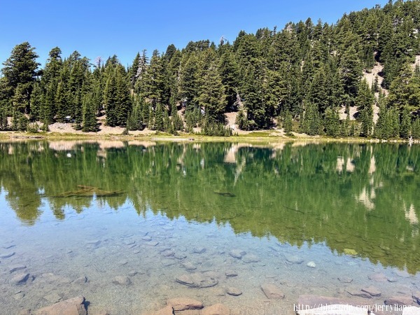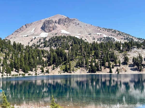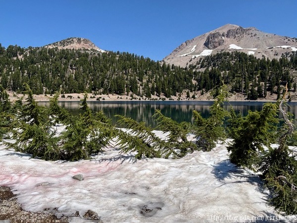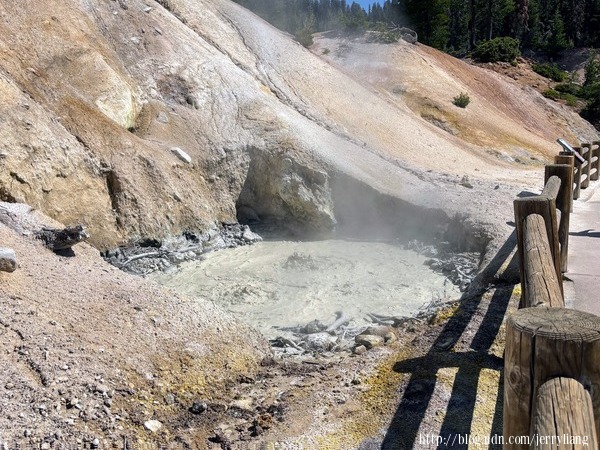Sulphur Works 是一個泥漿岩地形,在公路旁就可見不斷噴出的泥漿.Emerald Lake & Helen Lake 相鄰不遠,這裡已經超過海拔八千英尺,在七月的盛夏仍可見未溶的白雪,遠方的 Lassen 火山,倒影湖中的林木,還有那清新的空氣,真是讓人流連忘返.Lassen 火山口是非常熱門的登山步道,來回要四小時,而且一路沒有遮蔽,所以不在考慮範圍.在這兒遇到一位紐約來的老者,開著露營車來玩;他說十年前曾來此並且爬到火山口,但今天他不爬了,"我老喽"他說.