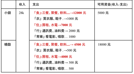 現在我們可從書中小資族理財案例,比較「小錢」與「曉馥」這兩個小資族收入跟支出。